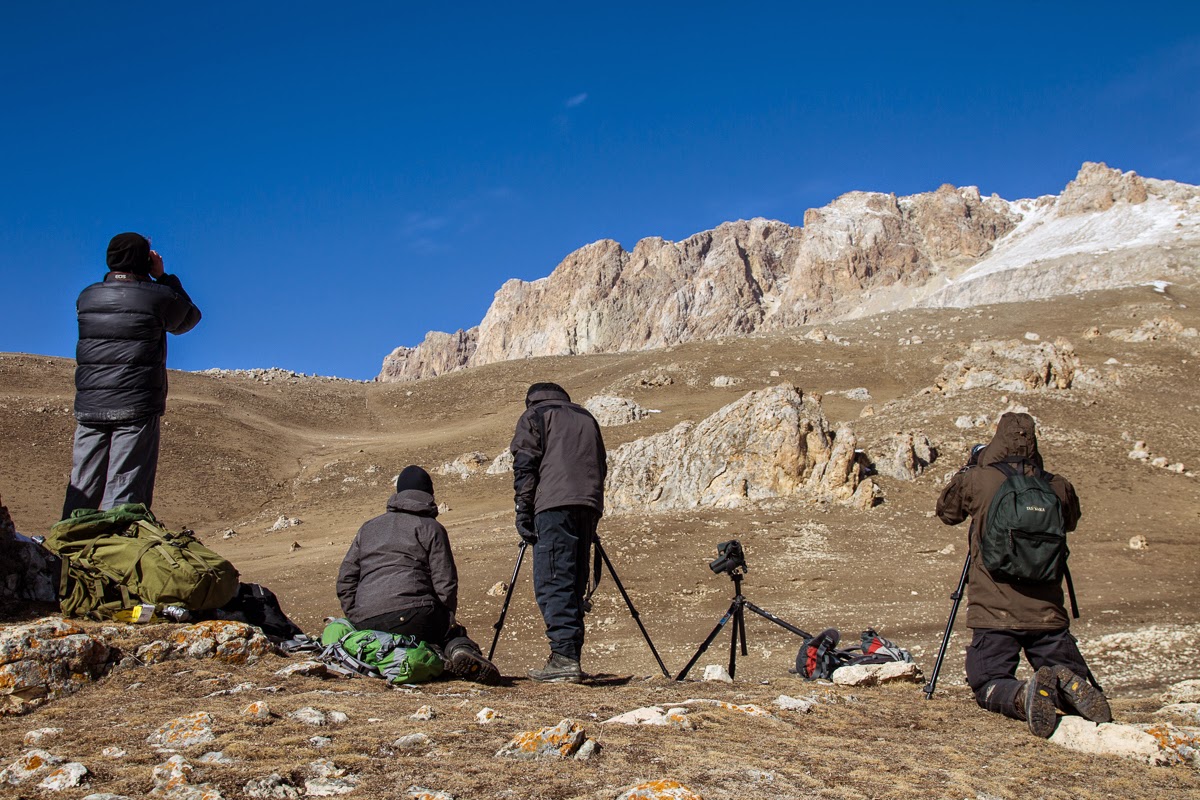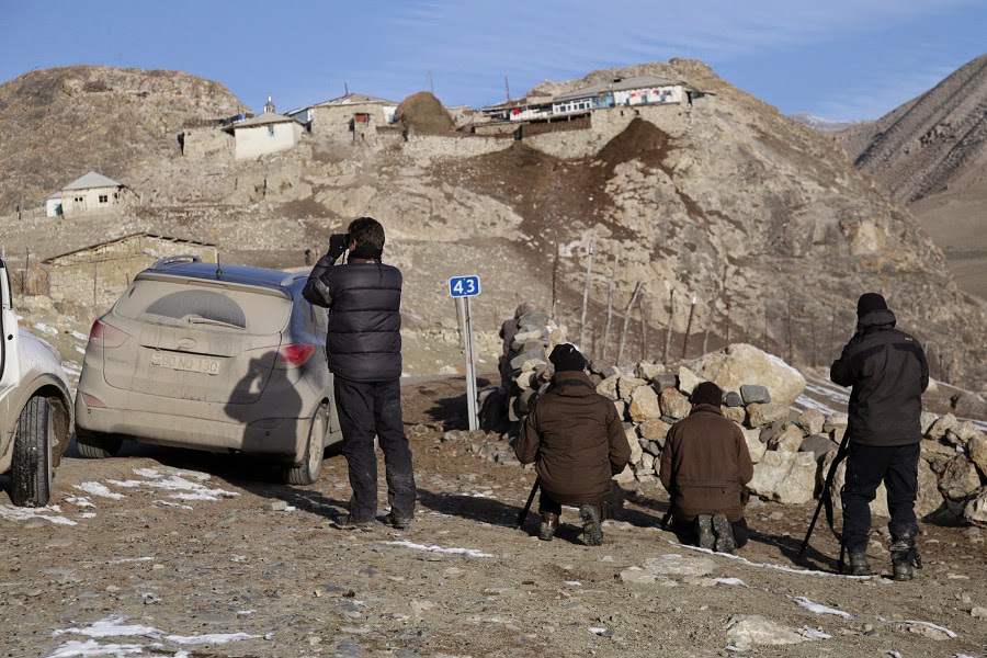 The asphalted road led us further to Xinaliq and arriving there we were happy that we had no trouble with snow and the sun warmed us with about +6°C. The weather conditions above 2.000 m asl were much more comfortable than in the lowland. A little hike up to 3.000 m asl produced more sightings of Lammergeiers, Griffon Vultures, Horned Larks, 27 Chukars, 42 Alpine and about 220 Red-billed Choughs. We also observed the spectacular hunting of up to 3 Golden Eagles preying on Caucasian Snowcocks at Qizil Qaya. After a long day we left Xinaliq in the evening and had once again a comfortable night in our hotel.