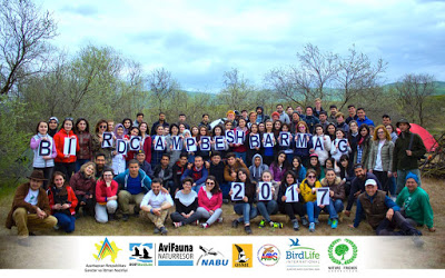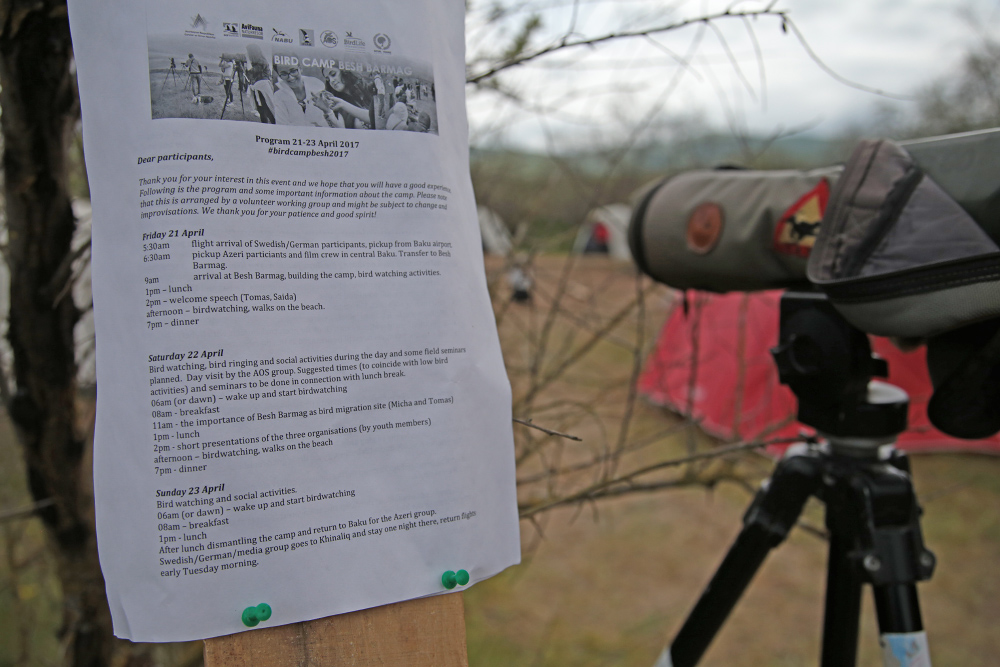 Between the 21st and 23rd of April, the meanwhile second larger international Bird Camp at the famous Besh Barmag bottleneck in Azerbaijan took place. Like the last Bird Camp in September 2016 it was again gratefully and excellent organised by NatureFriends Azerbaijan, SOF BirdLife (the Swedish BirdLife partner) and AOS (Azerbaijan Ornithological Society, the Azeri BirdLife partner). The initiative this year was sponsored by the Georgian tour operator Batumi Birding as well as BirdLife Switzerland. The group, composed of 21 Azeris, four Swedes and four Germans, spent three days with camping, bird watching and demonstrations of bird ringing in that indeed very special area. In addition, the bird camp this year was documented by both a reporter/photographer team from Baku Magazine as well as a documentary film crew that will produce a short promotional documentary about the camp. Exciting!