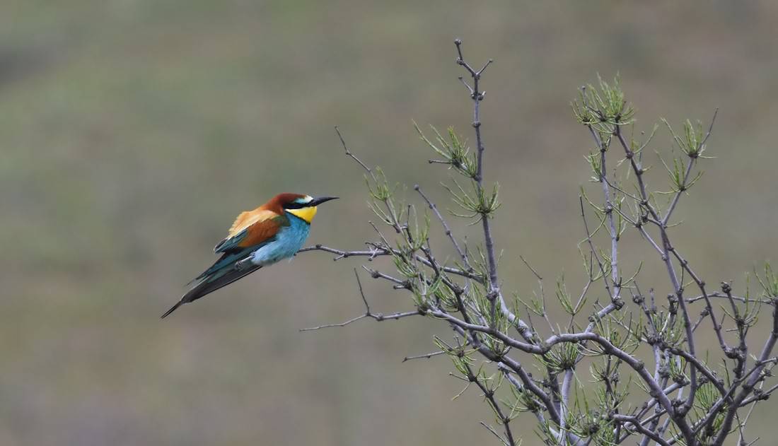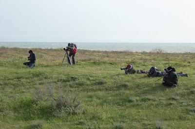 Unfortunately, as a result of some rain and strong winds, migration was rather slow during the three observation days. Nevertheless, birdwatching in the vicinity of the camp was much fun and produced a total of 115 species including 17 raptor species. Some 75 Black Kites, 15 Black Vultures and 50 Lesser Kestrel soaring the rubbish dump together with single Steppe and Eastern Imperial Eagles and Pallid, Montagu´s and Marsh Harriers as well as Merlins and Hobbys on migration. Four Dalmatian Pelicans and mixed flocks of waders flew north along the coastline as did a few Citrine Wagtails and Tawny Pipits. In the beautiful green and flowering steppes different subspecies of Yellow Wagtails, Black-winged and Collared Pratincoles and a single male Little Bustard were observed. The colourful species, such as Ortolan Bunting, Hoopoe and European Bee-eaters, were a regular sight joined by a single migrating Blue-cheeked Bee-eater. In the bushes by the camp we saw and heard Green and Menetriés Warbler, Scops Owl and Woodchat Shrike. The rather low results of the migration counts can be checked at trektellen.org (http://trektellen.org/count/view/1533/20170422).