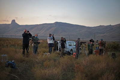 When Hans and Simon Olk from the Netherlands arrived at Besh they started with a good day and about 96.000 birds, mainly Starlings but also 5.000 Black-headed Gulls, 500 Stock Doves, 5 late Black-winged Pratincoles, two Rustic Buntings and 3 Siberian Buff-bellied Pipits of which many more should follow during the next weeks. End of October then provided a great variety of all kinds of songbirds (mainly pipits, larks, and finches), many different raptor species (including the first Saker of the season) regular flocks of Little Bustards, and also good passage of waterbirds with eg 34 Lesser White-fronted Geese on October 28th, the first flocks of Pygmy Cormorants, hundreds of herons and flocks of both, Great White and Dalmatian Pelicans.