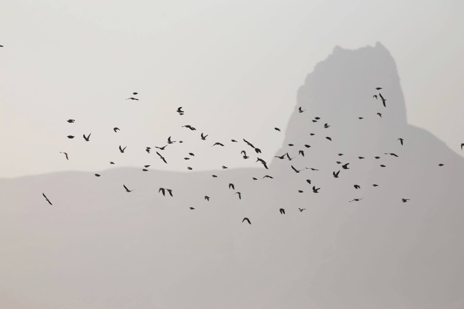 | Migrating Calandra Larks with Besh Barmag in the background © Michael Heiß |