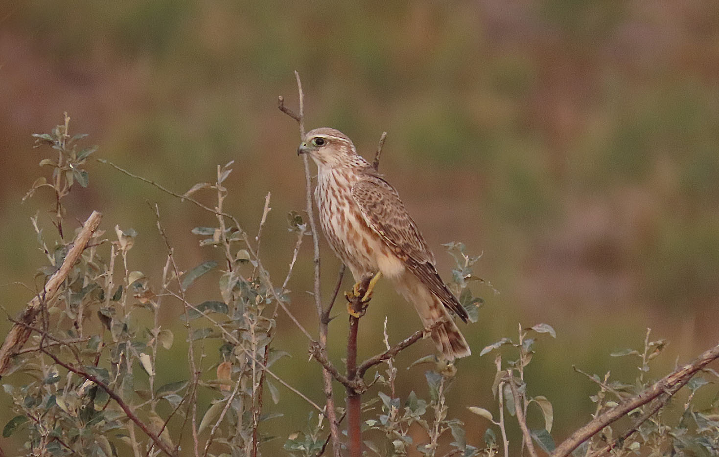 Our first Little Bustards came on the 22nd October when a total of 47 flew south – this proved to be the highest count of our trip. The 22nd also produced a memorable incident when a Calandra Lark being chased by a Merlin took shelter under our car. The Merlin landed briefly on the car, just a metre or two away from us, then moved to a pile of earth some five metres away, before deciding that a bush 15 metres away was a safe distance to watch us from. The Merlin was a stunning juvenile of the pallidusrace and looked strikingly different from the birds we see in Britain.
