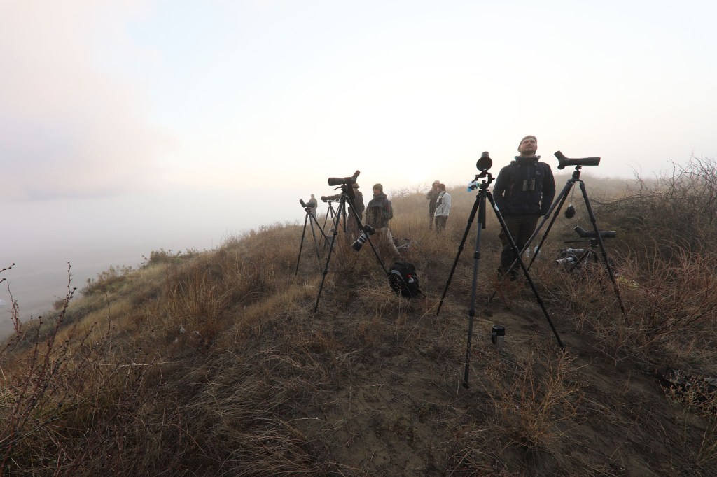 Our first birding day on 6 November brought us to the Absheron National Park. We camped outside and passed the entrance after the park opened. In the morning hours we witnessed quite some migration of passerines, mainly Chaffinches, Bramblings, Siskins, Linnets, Goldfinches, larks, thrushes and pipits. Highlights among the local birds were 22 Greater Flamingos, 7 Horned Grebes in the Caspian Sea, 6500 Coots in lagoons, 36 Grey Plovers, 15 Kentish Plovers, 300 Dunlins, 15 Sanderlings, 1 Jack Snipe, 15 Slender-billed Gulls, 1 Peregrine, 1 Coal Tit out of range, 1 Bluethroat and 2 Red-breasted Flycatchers. We tried to check each of the about 30 Penduline Tits carefully looking for rarer subspecies. We were lucky with at least three caspius-Penduline Tits. They usually breed in the northern Caspian region and were only once before observed in Azerbaijan (October 2007 at Besh Barmag). As this record was not documented by photographs the observed birds from Absheron can be considered as first records for the country. Most of the remaining birds looked like the local menzbieri-subspecies (similar appearence to the nominate pendulinus). Two rather tame Desert Wheatears along the beach made this first birding day perfect (https://ebird.org/checklist/S61219969). Heading to Besh Barmag we picked up two counters, Tohar and Erik, from the Batumi Raptor Count, who joined us for some days.