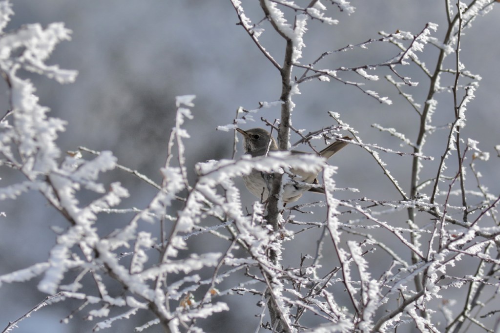 We decided to drive to Mistan in the Zuvand upland close to the Iranian border. In spring time this place is excellent for White-throated Robins, Radde’s Accentor or Crimson-winged Finch, but probably no birder visited this place during winter time in recent years. We quickly found the year-round resident species like a big flock of 25 Chukars, several Ring Ouzels here and there, Western Rock Nuthatches and a flock of 20 Red-fronted Serins. Further up the slope we heard strange thrush-like calls, which turned out to come from a Black-throated Thrush beautifully sitting on white frost covered branches. Few more birds hided in other bushes and we finally counted 5 individuals. What a great discovery! (https://ebird.org/checklist/S61759786).