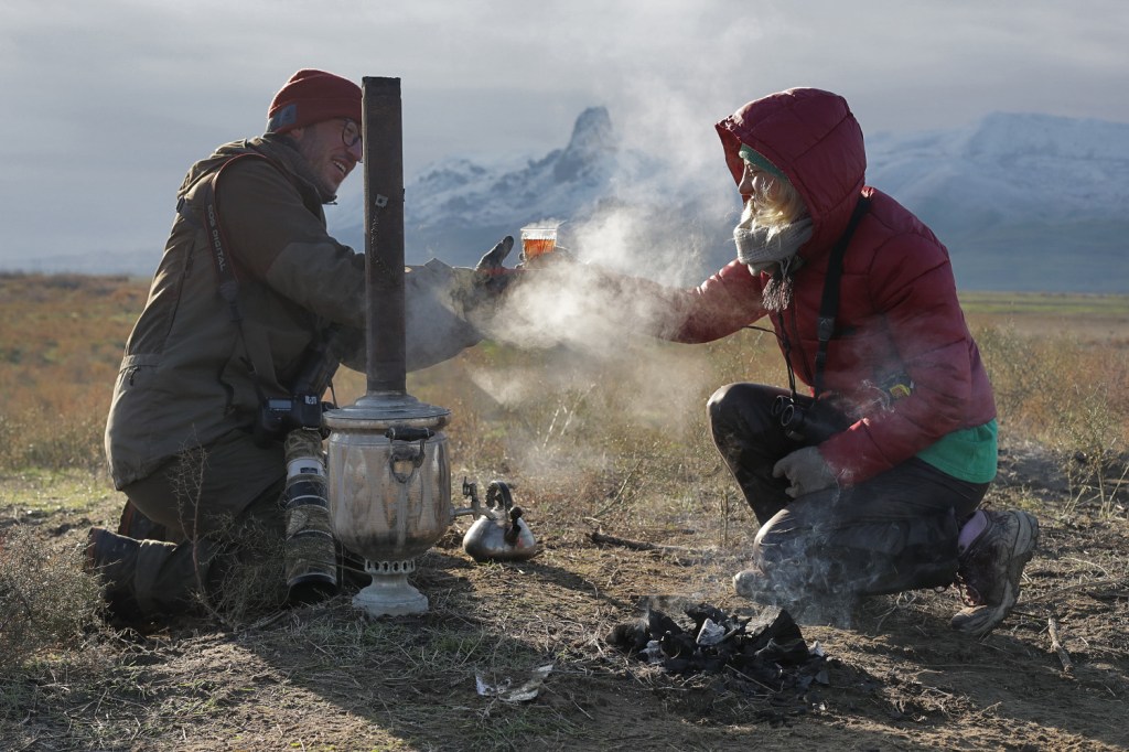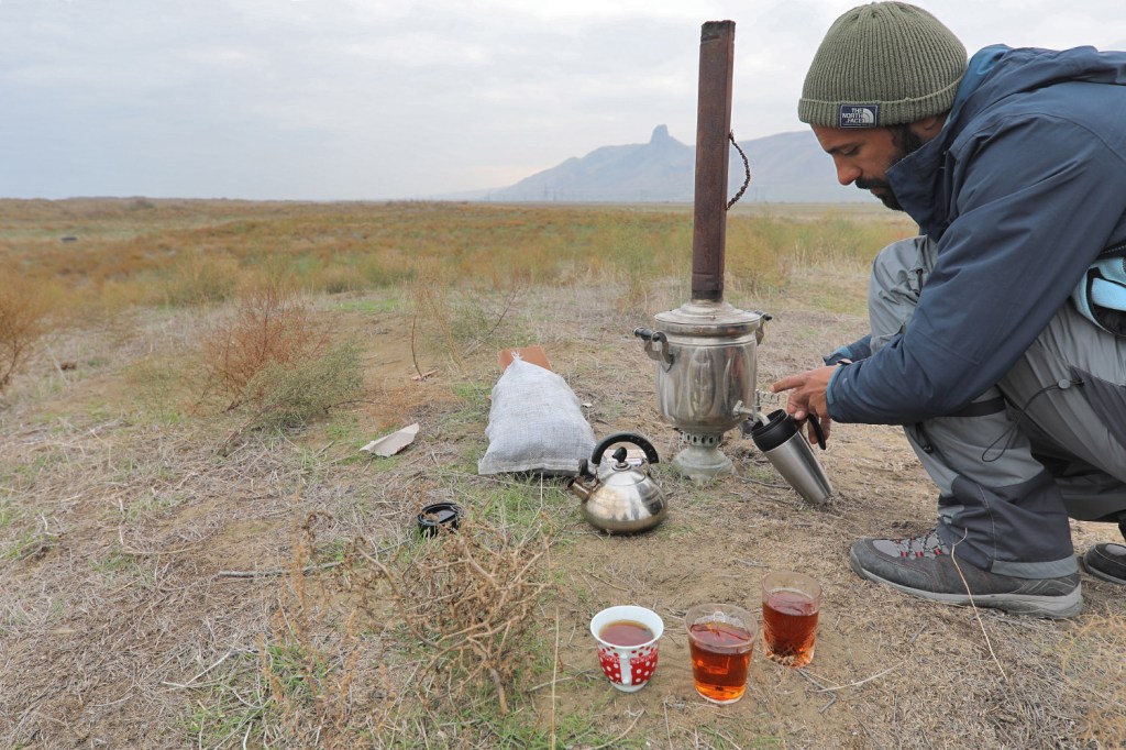 In the evening we arrived again in Zarat and conducted bird migration counts at Besh Barmag from 20 to 23 November. Weather was really an issue in these days. The 20 November was still ok with not too much rain, but a cold northerly wind. We already missed our shelter from last year, but as an improvement we were equipped with a nice samovar that offered us hot tea whenever needed. However, bird migration was fine on 20 November. Most passerines already passed through resulting in rather low numbers logged. Especially, Starlings, Rooks and larks migrated in manageable numbers. Highlights for this day were 601 migrating Dalmatian Pelicans, 227 Marsh Harriers and 75 Pallas’s Gulls (https://trektellen.nl/count/view/1533/20191120). On 21 November temperature dropped to a maximum of 6°C and rain poured the entire day. We still missed the shelter. Due to the bad weather, bird migration was low, but we observed about 10’000 migrating ducks, 86 Dalmatian Pelicans and the first two Waxwings for the counting spot was still ok (https://trektellen.nl/count/view/1533/20191121). The bad weather continued on 22 November with temperatures slightly above zero degrees. A continuous mix of rain and snow made us soaking wet within minutes. We counted more than 15’000 ducks, 2 Rough-legged Buzzards and 1202 Ruddy Shelducks that passed through in several flocks (https://trektellen.nl/count/view/1533/20191122). We really hoped for a spectacular event that happened several years ago under similar weather conditions with strong frost and snowfall in the northern Caspian region extending to the bottleneck area: https://trektellen.nl/count/view/1533/20111107 and https://birdingazerbaijan.org/2011/11/10/first-snow/. But nothing similar happened this time.