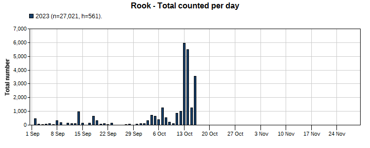The waterbird migration has been relatively slow in the past two weeks, with only a few hundred ducks and terns seen on their migration path. As the weather becomes colder, with temperatures dropping to a chilly 12°C on 12 October, late autumn birds have commenced their migration. This includes a significant increase in the number of Starlings (eg 19,406 heading south on 6 October) and Rooks (5,059 heading south on 13 October). The numbers of larks, buntings and finches are also on the rise, while the numbers of bee-eaters, wagtails, swallows, and pipits are diminishing with each passing day.