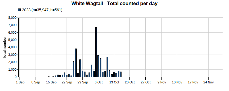 Despite the occasional slow pace of migration, the team experienced some exceptional days, particularly on October 5 (https://trektellen.nl/count/view/1533/20231005), October 6 (https://trektellen.nl/count/view/1533/20231006), and October 13 (https://trektellen.nl/count/view/1533/20231013).