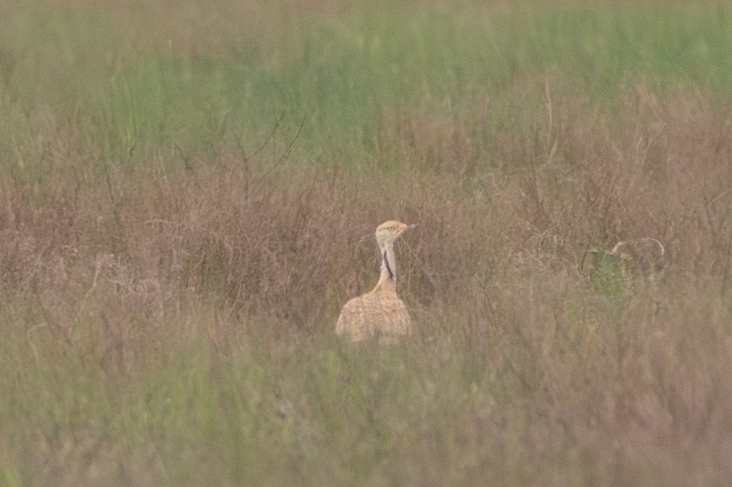 One of the most remarkable records of the year came from Absheron National Park on 29 April 2025, when an Asian Houbara (Chlamydotis macqueenii) was observed and photographed during a spring birding tour. This sighting marked the 11th national record of this globally Vulnerable species and, notably, the first modern spring record for Azerbaijan. Historically, the species has been recorded only sporadically in the country. The absence of leg rings on this individual suggests a wild origin, though its presence is likely linked to the Kazakhstan reintroduction programme, from which GPS-tracked birds have previously been shown to cross the Caspian Sea into Azerbaijan. The easternmost location of the sighting supports this scenario and highlights the importance of the Caspian corridor for long-distance movements.